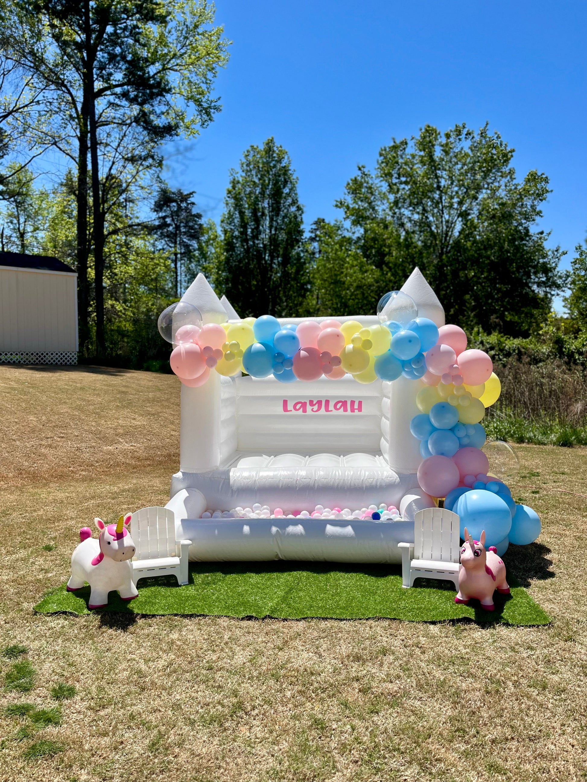 This design is made with various balloon sizes ranging from 5" to 24" inches. We do not provide the bounce house and/or the marquee lights. We have a list of preferred vendors we can share with you!